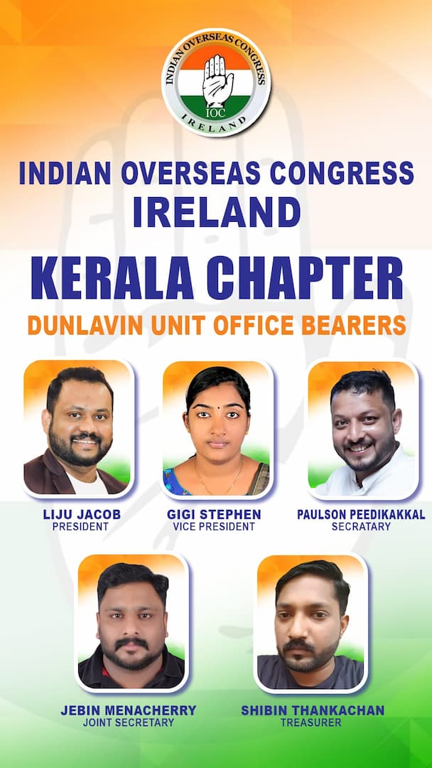 ഡബ്ലിൻ: ഇന്ത്യൻ ഓവർസീസ് കോൺഗ്രസ് (IOC) അയർലണ്ട് – കേരള ചാപ്റ്റർ ഡൺലാവിൻ യൂണിറ്റിന്റെ പുതിയ ഭാരവാഹികളെ തെരഞ്ഞെടുത്തതായി ഐഒസി നാഷണൽ പ്രസിഡന്റ് ലിങ്ക് വിൻസ്റ്റാർ മാത്യു അറിയിച്ചു.