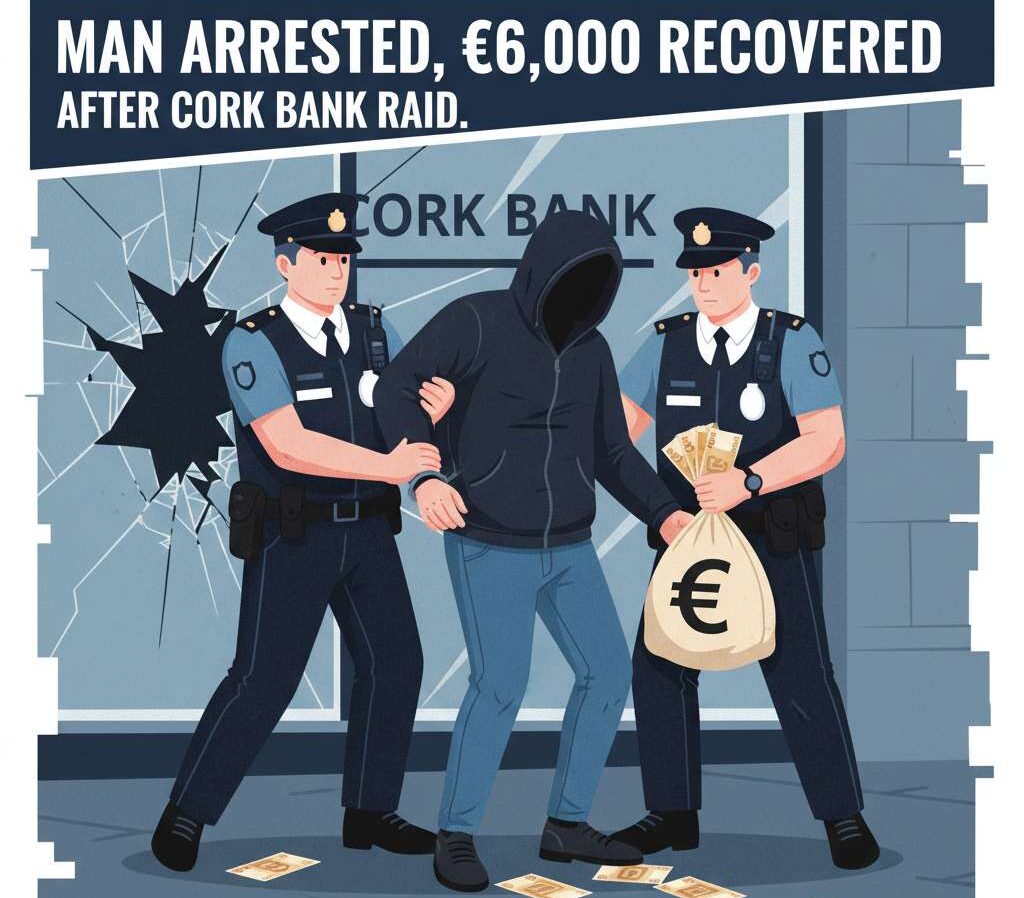കവർച്ചയ്ക്ക് ശേഷം, ഇയാൾ ബാങ്കിൽ നിന്ന് ഓടി രക്ഷപ്പെടുകയും, പിടിക്കപ്പെടുന്നത് ഒഴിവാക്കാൻ ഷോപ്പിംഗ് സെന്ററിലെ പൊതു ശുചിമുറികളിൽ വെച്ച് വസ്ത്രം മാറുകയും ചെയ്തു. സിസിടിവി ദൃശ്യങ്ങളുടെ അടിയന്തര പരിശോധന ഉൾപ്പെടെയുള്ള ഗാർഡൈയുടെ വേഗത്തിലുള്ള നടപടികൾ, സൗത്ത് ഡഗ്ലസ് റോഡ് പ്രദേശത്ത് നിന്നുള്ള ഒരാളുടെ അറസ്റ്റിലേക്ക് നയിച്ചു. പ്രധാനമായി, മോഷ്ടിച്ച പണമാണെന്ന് കരുതുന്ന 6,000 യൂറോയിലധികം അറസ്റ്റിനിടെ കണ്ടെടുത്തു.